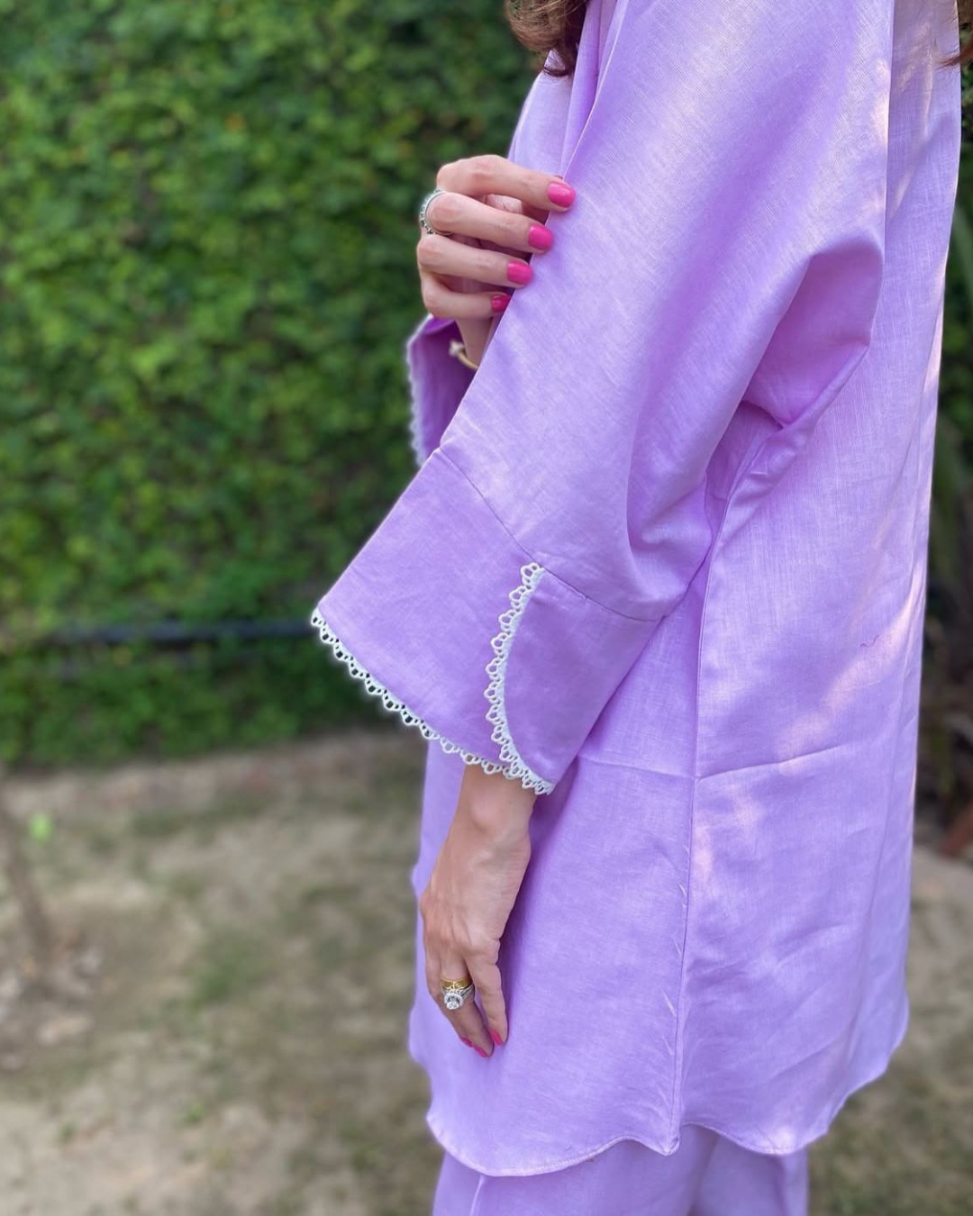 Breezy, matching separates in breathable, Irish linen. Round hemmed kurta with lace detailing around neckline and sleeves. Paired with skinny shalwar, with lace finishing .