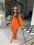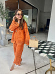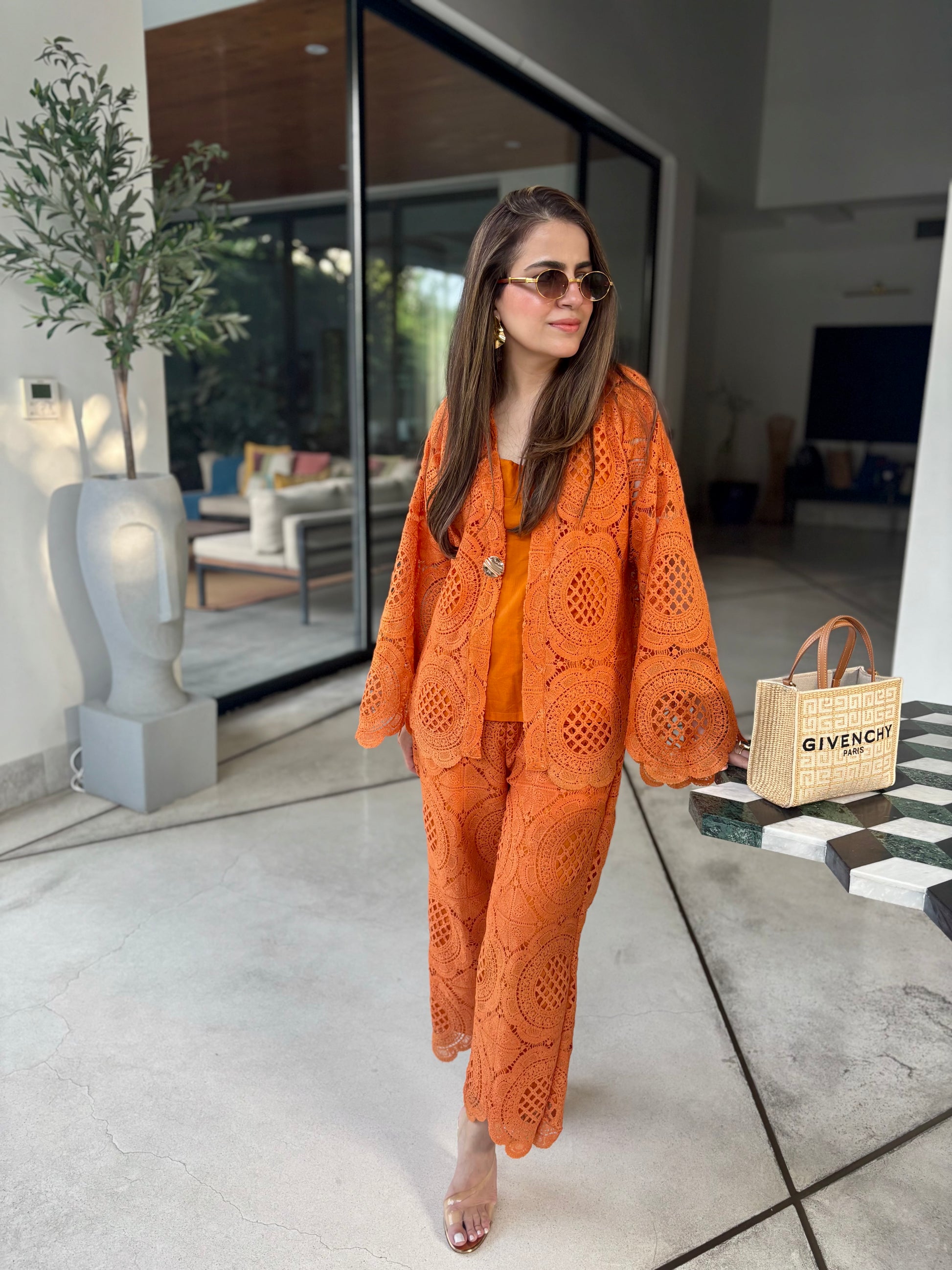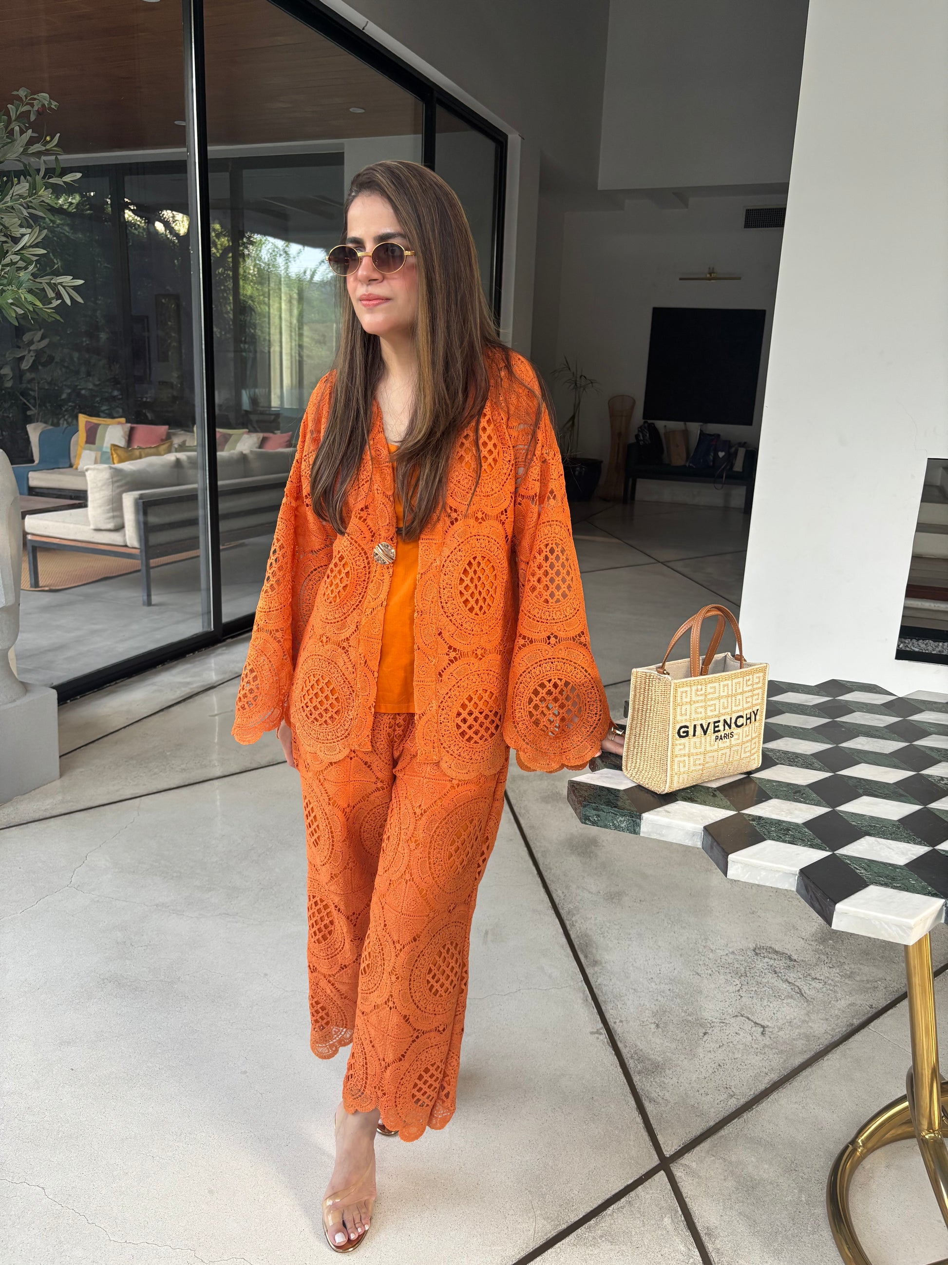 The perfect autumn duo - our drop shoulder, crochet jacket with scalloped sleeves and statement gold button. Paired with lined, scalloped pants. Wear it together or on its own! Matching lawn slip included.