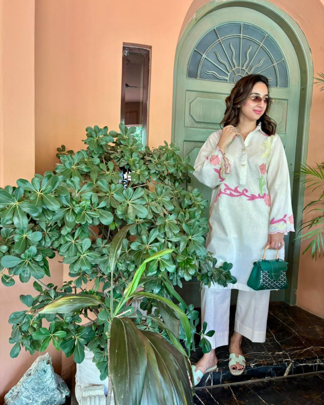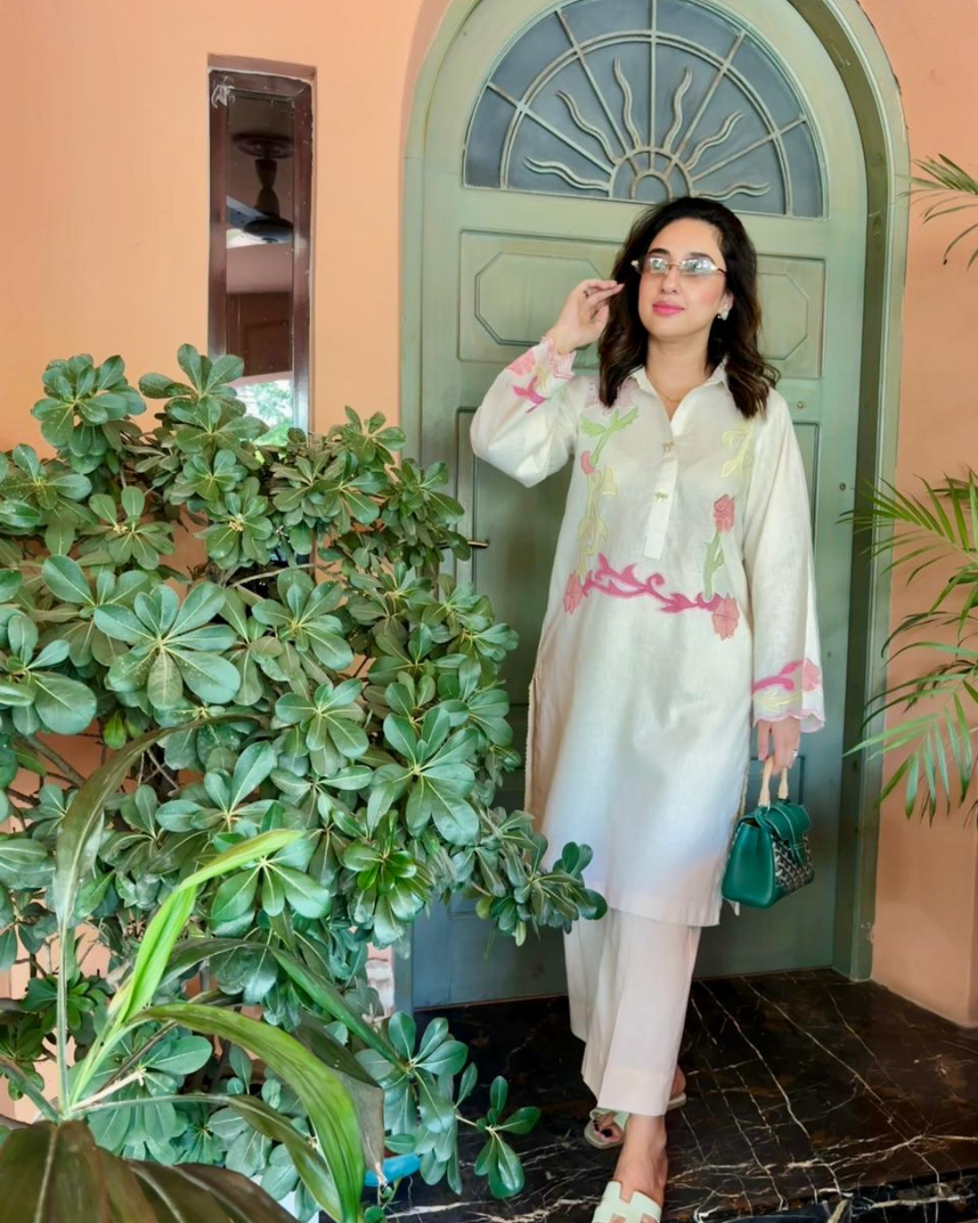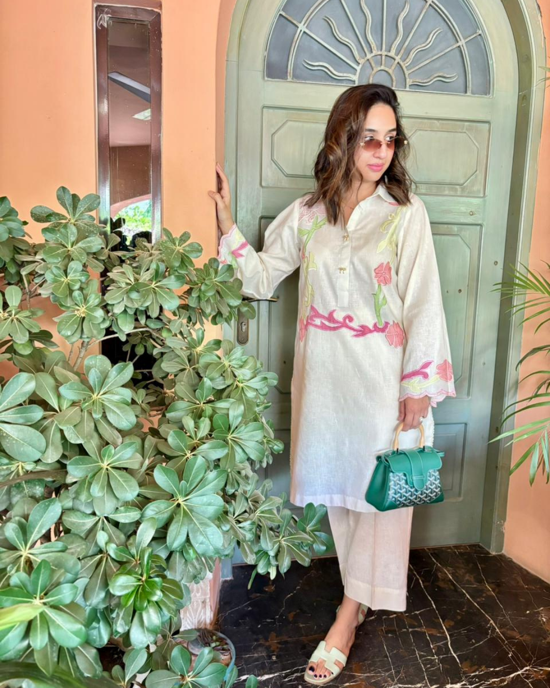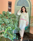 Collared set in Pure Irish linen, with pastel, appliqued embroidery and button detailing.