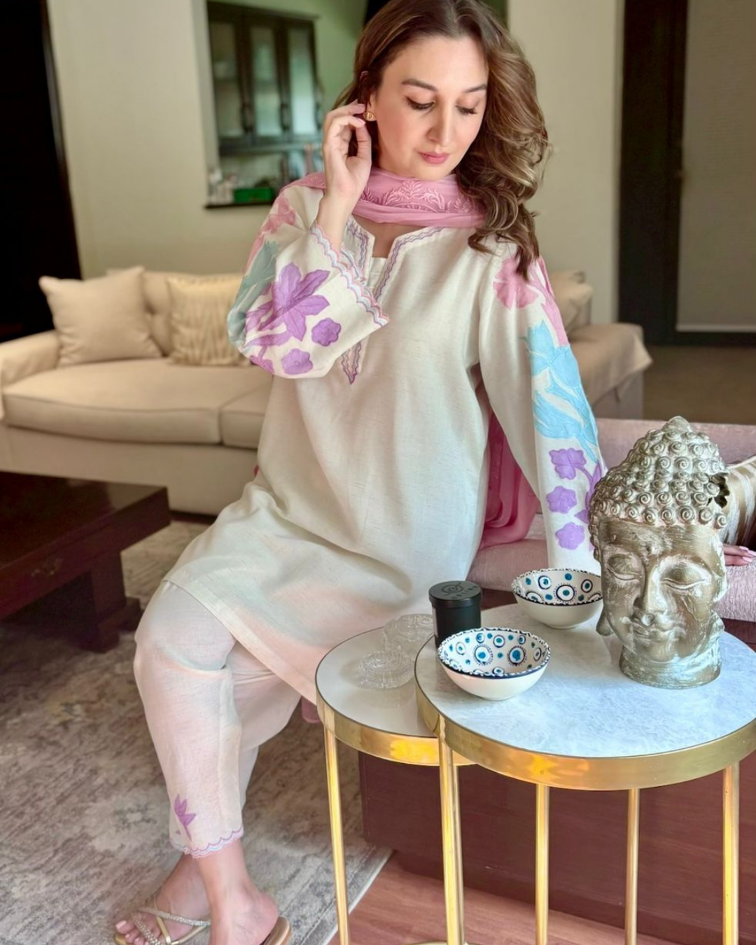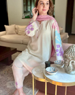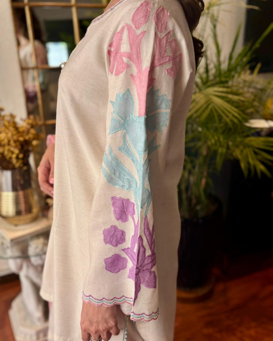 Pure, Irish linen kurta with pastel, appliqued embroidery on the sleeves and neckline. Complimented with pearl button detailing on the neckline and matching lace on the chaak.